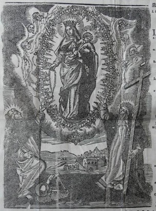 Au centre d’un chapelet à la croix maladroitement fleurdelisée pendant vers le bas, et entrelacé de feuillage et de roses, la Vierge Marie couronnée apparaît debout sur un croissant de lune, tenant l’Enfant Jésus sur le bras gauche. Auréolés de rayons, la Mère et l’Enfant offrent des chapelets à saint Dominique et à sainte Catherine de Sienne agenouillés en contrebas. Les deux saints sont eux aussi auréolés de rayons et dotés d’attributs : lys et chien à la torche couché près d’un orbe pour Dominique, couronne d’épines et grande croix plate pour Catherine. Le bas de l’image, entre les deux saints dévoile une foule de pèlerins en procession vers une église dominée par un dôme et environnée de collines. Dans le haut de l’image des putti accompagnent l’apparition.