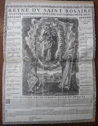Au-dessus de l’image : REYNE DV SAINT ROSAIRE / EXAVCEZ LES PRIERES QVE L’ON VOVS OFFRE POVR MOY.