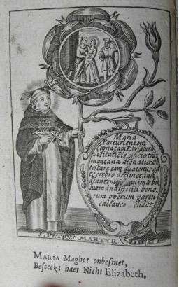 L’ouvrage destiné à la confrérie du rosaire d’Anvers s’ouvre par un frontispice signé Arnold Loemans mettant en scène dans une roseraie le Christ remettant rosaire et rose à sa Mère en présence de deux anges. L’absence de dominicains dans la scène a conduit à ne pas présenter cette pièce dans le catalogue.