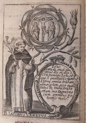 Saint Jacques de Venise, auréolé de rayons, debout sur la gauche de l’image, tient d’une main un lys-crucifix et de l’autre la tige de la rose dans le cœur de laquelle est représentée une Crucifixition.