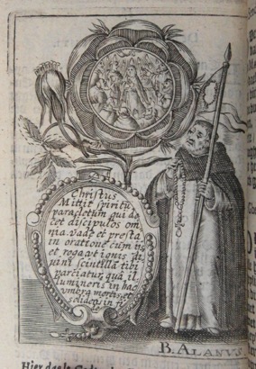 Debout à droite de l’image, le bienheureux Alain de la Roche contemple le mystère tenant d’une main un rosaire et de l’autre la bannière mariale.