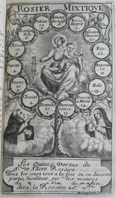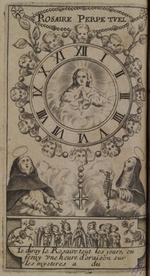 Deux dominicains sont agenouillés de part et d’autre d’un plant de rosier à triple tronc, symbolisant trois formes de la dévotion du Rosaire inscrites en français. Le rosier s’épanouit en une très grosse fleur centrale, structurée par de multiples cercles. Au centre, une Vierge voilée, couronnée et auréolée de rayons, présente dans chacune des mains un chapelet/rosaire et une couronne. La figure est insérée dans un cadran portant les douze chiffres romains des heures. Une première série de quinze cercles entoure ce cadran. Dans chaque cercle est inscrit l’intitulé d’une vertu. Quinze autres cercles extérieurs, parfois séparés par des feuilles ou/et boutons de rosier, entourent les premiers. En chacun d’eux est figuré l’un des mystères du Rosaire. Le premier des mystères joyeux, l’Annonciation, est représenté en bas à gauche. La lecture progresse dans le sens des aiguilles d’une montre, de sorte qu’en haut du rosier se trouve le troisième mystère douloureux, le couronnement d’épines. Dans le haut de l’image, encadrant le titre du frontispice, deux anges tiennent en main des bouquets de roses.