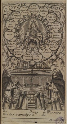 Planche d’illustration pour JEAN-VINCENT BERNARD DU S. ROSAIRE (?-1696), Le Triple Rosaire avgmenté ; Sçavoir, Le Grand Rosaire, Le Perpetvel, Et le Qvotidien. Suivi des quinze Samedys… III. Edition, A Tolose, Par Bernard Bosc Imprimeur & Marchand Libraire, ruë de la Porterie, 1676, p. 166.