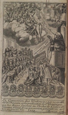 Les images ont vraisemblablement été commandées en raison du succès de la prédication de Jean-Vincent Bernard du S. Rosaire à Toulouse en octobre 1675. Elles étaient destinées tout aussi bien à l’illustration de son ouvrage qu’à servir de billets d’engagement aux confrères.
