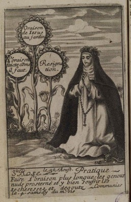 le .30. Aoust. / Ste Rose . Pratique . / Faire L’oraison plus longue, les genoux / nuds prosternè et y bien soufrir les / secheresses, et, degoutz . Communir / le .4. samedy du mois