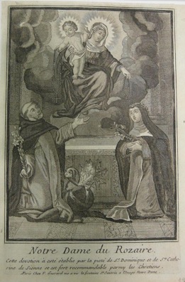 Notre Dame du Rozaire. / Cette devotion a esté établie par la pieté de St Dominique et de Ste Cathe- / rine de Sienne et est fort recommandable parmy les Chretiens. / A Paris Chez F. Guerard vis-à-vis la fontaine St Severin a l’Image Notre Dame.