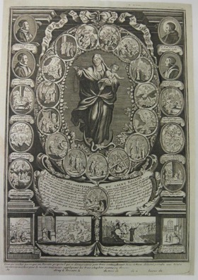 Tel quel, le motif central la gravure pourrait avoir été inspiré par une autre estampe car ici la Vierge et l’Enfant sont penchés vers d’invisibles destinataires de leurs dons.