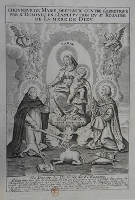 L’HONNEVR DE MARIE DEFFENDV CONTRE L’HERETIQVE / PAR ST DOMINIQ. EN L’INSTITUTION DV ST ROSAIRE / DE LA MERE DE DIEV.