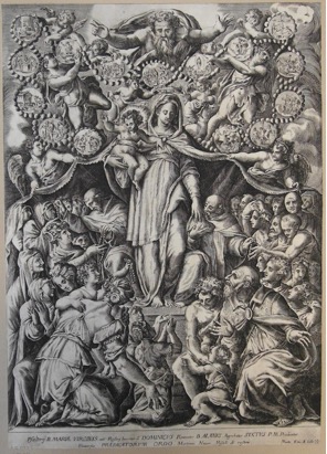 Au centre de l’estampe, la Vierge Marie est représentée debout, portant l’Enfant Jésus sur le bras droit. Elle reçoit l’hommage de saint Dominique qui baise sa main. Le manteau de la Vierge est déployé par deux anges pour abriter la foule des personnages à qui saint Dominique et peut-être Alain de la Roche distribuent des rosaires. En bas, à droite, un pape est agenouillé, levant son regard vers la Vierge de miséricorde. Deux angelots couronnent la Madone. Au-dessus d’elle, Dieu le Père jaillit, bénissant de ses bras étendus les dévots. Entre la Vierge et Dieu, des anges déploient les quinze médaillons des mystères, reliés entre eux par une chaîne de perles.