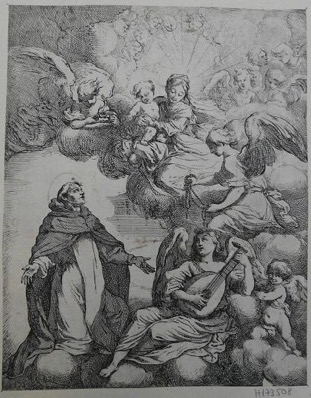 Telle quelle, la scène semble se dérouler entièrement au ciel où saint Dominique agenouillé dans l’angle inférieur gauche voit la Vierge Marie tenant l’Enfant Jésus dans un environnement d’anges, d’angelots et de putti. À mi-hauteur de l’estampe, sur la droite, un ange assis tend un rosaire au saint. À la droite de saint Dominique un autre ange assis, au moins aussi grand que le saint, joue de la musique sur un luth.