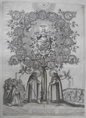 Un rosier couvre la plus grande partie de la surface de l’estampe. Son tronc est constitué de trois tiges. La tige centrale s’épanouit en une énorme rose au centre de laquelle la Vierge Marie siège, tenant l’Enfant Jésus debout sur le genou gauche. Mère et Fils tiennent des rosaires destinés aux hommes. Au-dessus de la Vierge deux anges soutiennent une couronne de roses et déploient un phylactère sur lequel est inscrit le titre de l’estampe. Les deux autres tiges se croisent et donnent naissance aux roses des quinze mystères dont la lecture débute en bas à gauche pour se poursuivre dans le sens inverse des aiguilles d’une montre. Quatre autres roses jaillissent du plant, comme quatre angles. En leur cœur sont figurés les portraits de saints de l’Ordre des Prêcheurs, identifiables par leurs attributs ; en bas, à gauche, saint Thomas d’Aquin ; en haut, à gauche, sainte Catherine de Sienne ; en haut, à droite, bienheureuse Agnès de Montepulciano ; en bas, à droite, saint Vincent Ferrier.