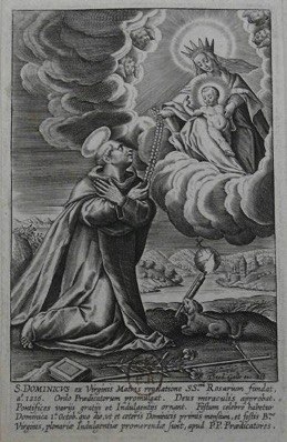 S. DOMINICVS ex Virginis Matris reuelatione SSmi Rosarium fundat, / a° 1216. Ordo Prædicatorum promulgat. Deus miraculis approbat. / Pontifices varijs gratijs et Indulgentijs ornant. Festum celebre habetur / Dominica 1a Octob. quo die, vt et ceteris Dominicis primis mensium, et festis Bmæ / Virginis, plenariæ Indulgentiæ promerendæ sunt, apud P.P. Prædicatores.