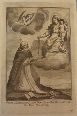 Au premier plan, à gauche, saint Dominique est agenouillé. Il est identifiable à l’habit de son Ordre, à l’étoile placée au-dessus de sa tête, au livre ouvert et au lys posés sur le sol. Dans l’angle supérieur droit, la Vierge Marie lui apparaît assise dans les nuées, tenant l’Enfant Jésus debout sur son genou gauche. De la main droite, elle tend au saint un chapelet dont la croix est prolongée par une médaille ronde. Au-dessus de saint Dominique, un ange dont le buste et les ailes sortent de la nuée, contemple, mains jointes, le don. Au fond, sur la droite de l’image, se devine un paysage montagneux.