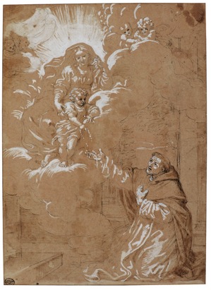 Sa vente, Paris, 26-28 mars 1840, n° 1310 : « Corneille (Michel) Saint Dominique recevant le Rosaire de la Vierge ; grand dessin esquissé à la plume, lavé au bistre et rehaussé de blanc » ;