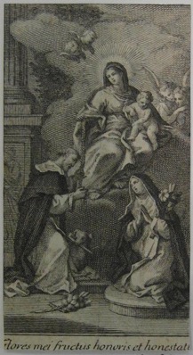 Le format de cette estampe rognée pourrait en faire un frontispice. La scène de la réception du rosaire par saint Dominique et sainte Catherine de Sienne a ainsi été retenue comme frontispice des deux volumes du bréviaire de l’Ordre édité à Paris chez Louis-Guillaume de Hansy en 1770[1]. Il peut également s’agir d’un livre dédié explicitement à la Vierge Marie, voire, plus spécifiquement, au Rosaire.