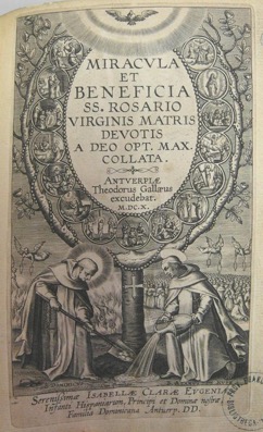 MIRACVLA / ET / BENEFICIA / SS. ROSARIO / VIRGINIS MATRIS / DEVOTIS / A DEO OPT. MAX. / COLLATA. / ANTVERPIÆ / Theodorus Gallæus / excubedat / M.DC.X