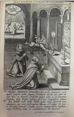 A. Mulier Antuerpiæ Dæmonibus sese pacto deuouerat, quod / ipsum proprio etiam sanguine firmauerat. Postea verò quàm mi: / litiæ huic, et Rosarij Sodalitio nomen dedit ac sacramentum ; / Diabolus iussu Virginis (testatus est id ipse) chirographum restituit. / B. Non absimili modo mulier ibidem, quam varijs figurarum terri: / culamentis, qui solet distorquebat, liberata est quippe vbi huic / se Societati inseruit, Virginis gremio tanquam portui tutissimo, atque hostibus inuio se committentem, ille deseruit. / Ex Thesauro magno Sodalitatis SS. Rosarij.