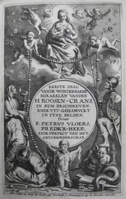 Titre illustré pour Petrus VLOERS (vers 1603-1663), Eerste [Tweede] deel vande wonderbaere Mirakelen vanden H. Roosen-Crans, in rym beschreven, ende vyt-ghedrvckt in fyne belden, Door F. Petrus Vloers, Predick-Heer, ende Prefect van het Arts-broederschap,