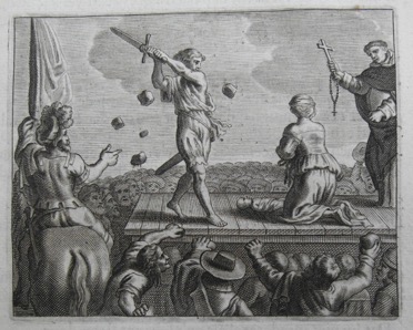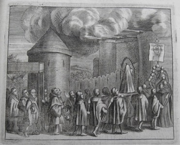 Plus d’un siècle plus tard le titre illustré servit de frontispice à un ouvrage destiné aux célébrations du bicentenaire de la victoire sur les turcs à Lépante[1]. Trois des planches du volume 2 de l’ouvrage de Petrus Vloers, celles relatives à la bataille, furent également réemployées. La prosternation du pape Pie V en action de grâce figure ainsi dans ce nouvel opuscule (voir ci-après, volume 2, planche 3).