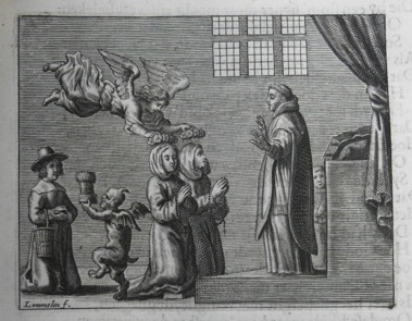 À gauche du titre, une femme voilée, l’Église, tient une lampe allumée. À droite, un chevalier armé aux armes de la Vierge tient d’une main le rosaire. La femme écrase une femme assise au sol, la tête dans un orbe transparent, les mains liées dans le dos, sans doute l’allégorie de la vanité du monde si l’on en juge d’après les dés, cartes, raquette et balle posés près d’elle. Le soldat écrase un démon aux oreilles pointues, à la queue de serpent enroulée autour d’un soufflet, lui aussi aux mains liées dans le dos. Enfin, sous le titre, Eros, les yeux bandés, est agenouillé les mains dans le dos, son arc et sa flèche brisés devant lui.