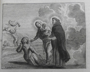 Au-dessus du titre, la Vierge Marie siège dans les nuées tenant de la main droite l’Enfant Jésus assis sur ses genoux et de la main gauche un orbe. Deux putti encadrent sa tête tandis que deux angelots, à la même hauteur, jettent des roses. Deux angelots, à la hauteur de ses genoux, tiennent un rosaire qui encadre le rond du titre.