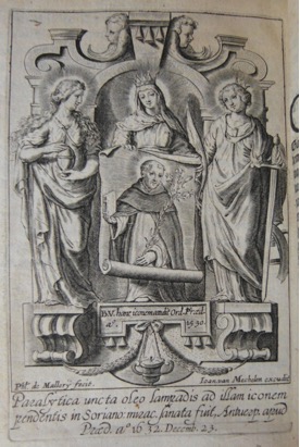 Planche pour Ignazio CIANTES (dit Silvestre FRANGIPANE, 1594-1667), Mirakelen Des hemelsch ende vvijt-be-roemde beeldts van den H. Patriarch Dominicvs te Soriano. By een vergadert door den Eervveerdighen P.F. Sivester Frangipane, van d’Orden der Predick-heeren. Nu over-gheset uyt d’Italiaensche in onse Neder-landtsche tale, door P.F. Æ. V. S. Religieux der selver Orden, T’Hantvverpen, By Jan Cnobbaert, by het Professen-huys der Societeyt Iesv in S. Peeter, 1633, avant le premier chapitre.