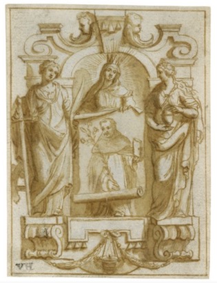 Dessin préparatoire pour la planche éditée pour Ignazio CIANTES (dit Silvestre FRANGIPANE, 1594-1667), Mirakelen Des hemelsch ende vvijt-be-roemde beeldts van den H. Patriarch Dominicvs te Soriano. By een vergadert door den Eervveerdighen P.F. Sivester Frangipane, van d’Orden der Predick-heeren. Nu over-gheset uyt d’Italiaensche in onse Neder-landtsche tale, door P.F. Æ. V. S. Religieux der selver Orden, T’Hantvverpen, By Jan Cnobbaert, by het Professen-huys der Societeyt Iesv in S. Peeter, 1633, avant le premier chapitre.