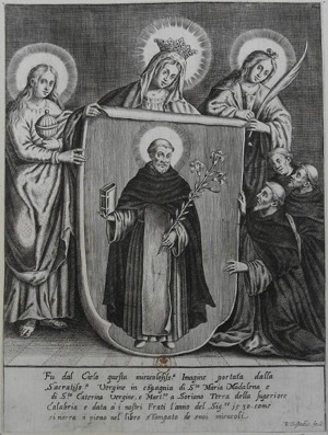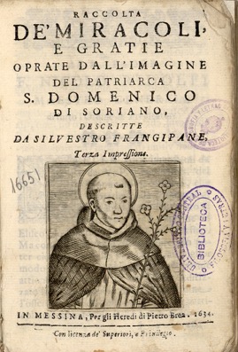 Vignette de titre pour Ignazio CIANTES (dit Silvestre FRANGIPANE, 1594-1667), Raccolta de’ Miracoli e gratie operate dall’Imagine del Patriarca S. Domenico di Soriano, descritte da Silvestro Frangipane, Terza Impressione, In Messina, Pergli Heredi di Pietro Brea, 1634.