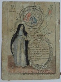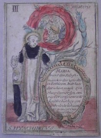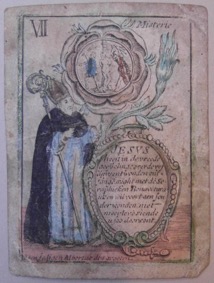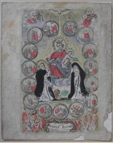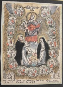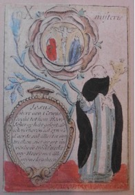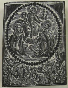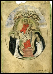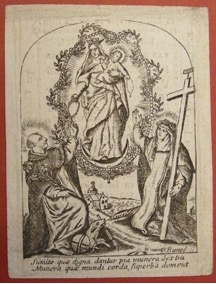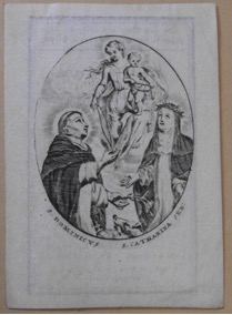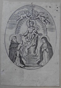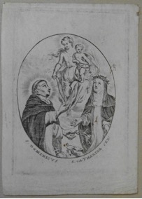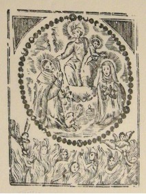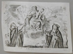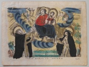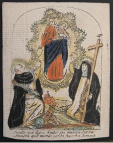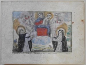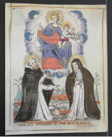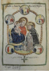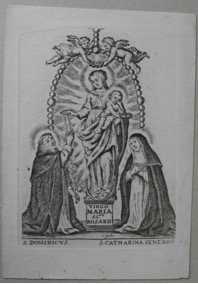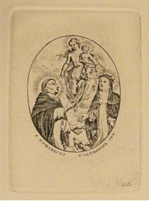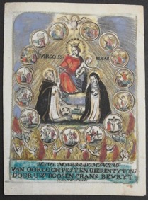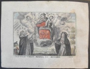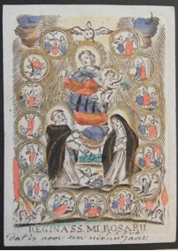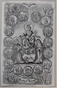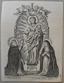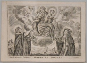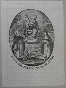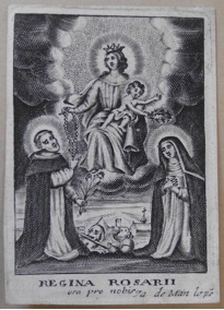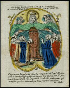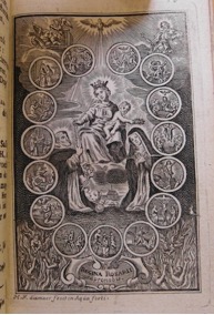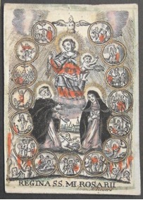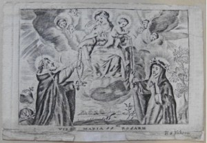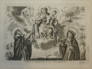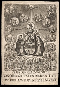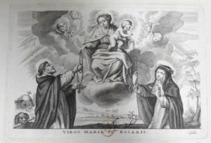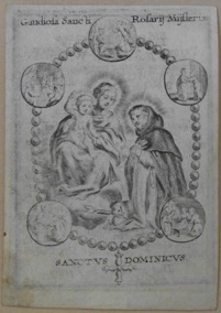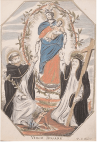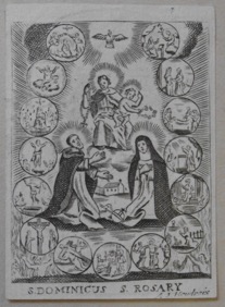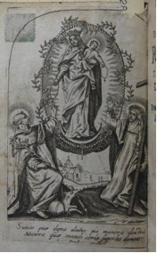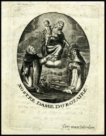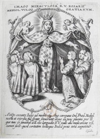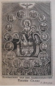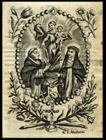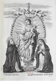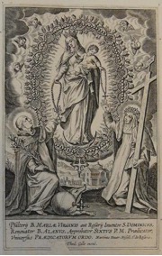 [1] Frontispice dans Les Fruits et graces dv tres-Saint Rosaire, tirez dv Bvllaire de la Confrerie. Reueu & approuué de son Eminence le Cardinal Albici, par le commandement de la Congregation du S. Office, A Cologne, Chez Pierre Hilden, 1677.