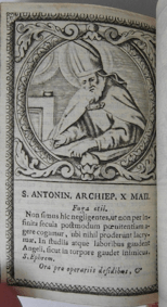 Les feuillets mesurent environ 10,5 x 6,5 cm. Dans l’exemplaire de l’édition flamande conservé à la bibliothèque universitaire d’Anvers, ils ont été massicotés pour être reliés et la reliure n’a pas permis d’en prendre les dimensions exactes. À l’intérieur de la bordure décorative qui encadre la page, la figuration du saint mesure environ 5,7 x 5,7 cm.
