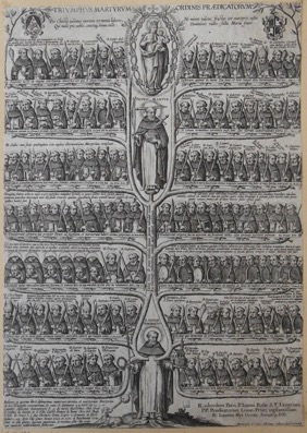 En bas de l’image, au centre, saint Dominique se tient debout, une étoile sur le front ; il est accompagné de son attribut, le chien à la torche enflammée. De sa poitrine partent deux branches maîtresses qui se ramifient, chaque branche portant de nombreux frères martyrs dont les noms sont inscrits au-dessus d’eux. La plupart tiennent en main les instruments de leurs supplices. Très exactement au-dessus du saint fondateur, une excroissance des branches forme une sellette sur laquelle se tient le protomartyr de l’Ordre des Prêcheurs, Pierre de Vérone. En pied, le crâne fracturé par un sabre et la poitrine transpercée par une épée, il tient en main droite une palme et en main gauche un livre fermé surmonté des trois couronnes de sa sainteté. Les branches principales montent encore plus haut et s’affinent pour entremêler des rameaux à une mandorle du Rosaire dans laquelle est représentée la Vierge Marie, debout, tenant l’Enfant Jésus sur son bras gauche.