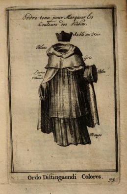 L’habit des frères est ainsi décrit à la page 89 : « Ceux de cet ordre portent une tunique & par dessus une Patience & sur cette Patience un Capuchon tout blanc. Lorsqu’ils sortent ils portent encore un manteau avec un Capuchon noir ». Le terme « patience » pour désigner le scapulaire est très spécifique. Il n’a été rencontré qu’en cet ouvrage[2] et dans la version italienne de l’ouvrage d’Odoardo Fialetti (patienza) [Cat. 726]. En revanche, le terme est en usage dans l’Ordre du Carmel[3].