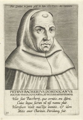 PETRVS BACHERIVS, DOMINICANVS / DOCTOR THEOLOGVS, POËTA, ET ECCLESIASTES EXIMIVS. / Hæc sunt Baccherij, quæ cernitis, ora diserti, / Cuius lingua sacrum nil nisi manna / Hæresewn vixit mastijx immitis, & idem / Mitis amor Charitum, Piëridumque fuit. / 15.
