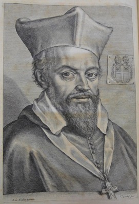 Des armoiries gravées sur un parchemin clouté au mur complètent le portrait, indiquant, par la crosse et la mitre, que Nicolas Coeffeteau avait été nommé évêque de Dardanie in partibus en 1617, puis évêque de Marseille en 1621.