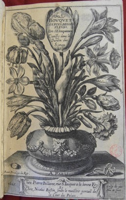 D’un vase assez bas de hauteur mais ouvragé jaillit un bouquet de fleurs. La plus précieuse car la plus coûteuse est placée au centre et porte le titre de l’ouvrage sur l’un de ses pétales. Les autres fleurs portent le nom des contemporains réputés pour leur éloquence. Nicolas Coeffeteau (1574-1623) est ainsi symbolisé, en haut, à droite, par une jonquille . Le vase est posé que une table au devant de laquelle un linge a été clouté pour porter l’adresse. Sur la table, à gauche du vase, un insecte complète la nature morte.