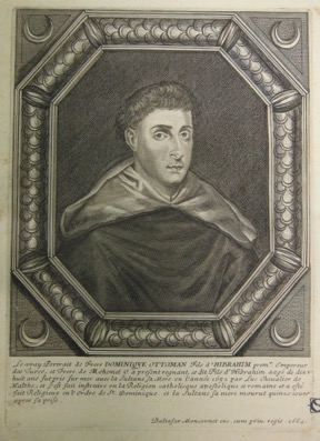 Le vray Portrait de Frere DOMINIQVE OTTOMAN Fils d’HIBRAHIM premr Empereur / des Turcs, et Frere de Mehmet 3e à present regnant, ce dit Fils d’Ibrahim aagé de dix: / huit ans fut pris sur mer auec la Sultane sa Mere en l’année 1652 par Luc Cheualier de / Malthe, et s’est fait instruire en la Religion catholicque apostolique et romaine et a esté / fait Religieux en l’Ordre de St Dominique. Et la Sultane sa mere mourut quinze iours / apres sa prise. / Baltasar Moncornet exc. cum priu. Regis. 1664.