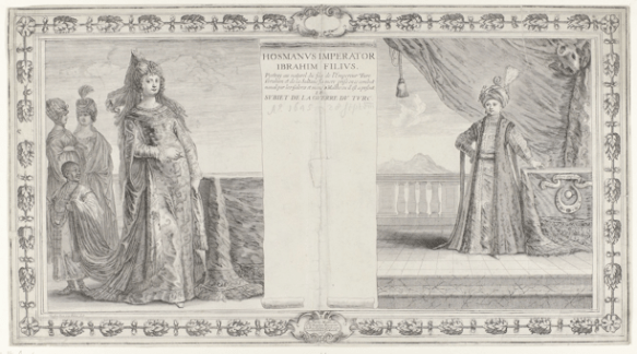HOSMANVS IMPERATOR / IBRAHIM FILIVS. / Portray au naturel du fils de l’Empereur Turc / Ibrahim et de la Sultane sa mere prise en ce combat / naual par les Galeres et mené a Malthe ou il est a present. / LE / SVBIET DE LA GVERRE DV TVRC.