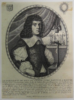 LE PORTRAIT DV FILS DV GRAND TVRC BAPTISÉ À MALTHE, / Usman tenu communem[en]t pour le fils de Sultan Ibraim Empereur de Constantinople / et de Trebisonde, Grand Seignr des Turcs, ayant esté pris petit enfant par les gale / res de Malthe dans le grand Gallion en l’année 1644. Et il est a Malthe ou il a esté es: / leué, on la mis dans le conuent des Peres de St Domini ou par œuure du St et edifica: / tion de sa religion depuis 15 mois s’est conuertit le 23me de feburier en 1656. Il fut / baptisé et luy mesme a esleu son nom Dominique de St Thomas, et tenù sur les fonts / du St Baptéme par son Altesse Mr le Grand Me de Malthe, auec la joye des peùples et les / Cannonades de tous les Chateaux. / Baltaz. Moncornet ex. auec pr. 1657