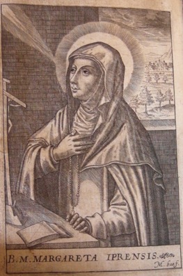 Marguerite d’Ypres est présentée debout, en ¾, de trois quarts tournée vers la gauche. Vêtue de l’habit de son Ordre, elle se tient devant un autel sur lequel se dresse un crucifix. La main droite en apposition sur la poitrine tient un rosaire tandis que la gauche s’agrippe au bord de l’autel. Marguerite est auréolée et un rayon de lumière divine partant du coin supérieur gauche vient la visiter. La pièce dans laquelle se trouve Marguerite s’ouvre, par une fenêtre, sur un paysage.
