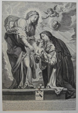 À gauche la Vierge Marie, debout sur une marche, confie l’Enfant Jésus à Agnès de Montepulciano. La religieuse est agenouillée sur le bord de la marche à droite de l’image, vêtue de l’habit de son Ordre. Des deux mains elle tient l’Enfant qui lui présente une croix passée sur un ruban. À ses genoux trois pierres évoquent le don qui lui fut fait. Dans le ciel, au-dessus de la tête de la religieuse, un angelot lance des fleurs tandis qu’un putto contemple la scène. En bas de l’image, au centre, sont figurées les armoiries de la dédicataire.