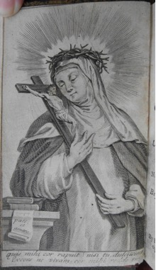 Troisième état : la planche a été entièrement reprise. Les séries de points qui structuraient le modelé du visage et des mains dans le premier état est encore perceptible. Mais en élargissant les tailles, la reprise a considérablement alourdi le dessin. Frontispice pour Ludovicus ROBYN (?- ?), Van de voorsienigheyt Godts, van de deugt der gehoorsaemheyt, en van den weg der volmaektheyt, Door Godt Almachtig kenbaer gemaekt aen de Seraphynsche Maget, en Moeder de Heylige Catharina van Senen, Na aen onse Nederlanders in’t vlaems mede-gedeelt door P. Ludovicus Robyn der Predik-heeren Orden, Tot Ghendt, By Franciscus en Dominicus vander Ween op de Cooremerct Stads Druckerye, [1717]. Belgique, Anvers, Bibliothèque universitaire – cote : DEPD.A4942.