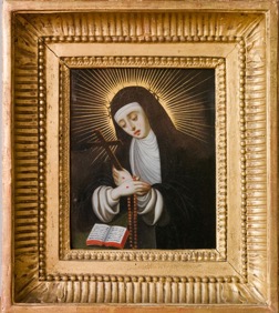 Dans une alcôve, Catherine est représenté en 3/4 et de trois quarts vers la droite. Le coude appuyé sur un autel, elle tient dans ses mains un crucifix qu’elle contemple et un rosaire. Sa tête est couronnée d’épines mais ses mains ne portent pas de stigmates. Sur l’autel, un livre de petit format est ouvert sur un verset du Cantique des Cantiques.