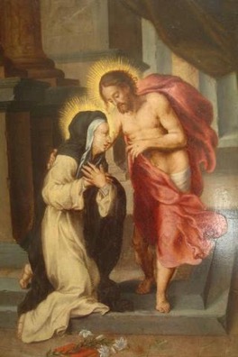 En haut, à gauche, un rideau est tiré pour dévoiler la scène qui se déroule à l’intérieur d’une église, sur les marches d’un autel. Sur cet autel le crucifix est voilé par des nuées, habitées par quatre putti, témoins de l’apparition du Christ à sainte Catherine de Sienne. Le Christ ressuscité, aux stigmates bien visibles, entoure de son bras gauche les épaules de la tertiaire agenouillée. Catherine, qui n’est ni stigmatisée, ni couronnée d’épines, mais dotée d’une auréole de lumière blanche, n’a d’yeux que pour la plaie du côté. Près d’elle, au pied des marches, une branche de lys repose sur un livre fermé.