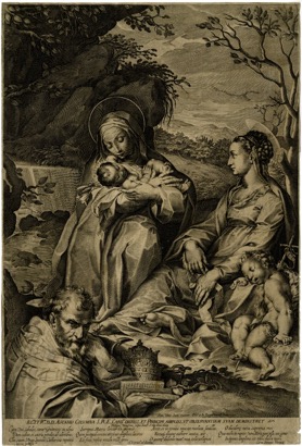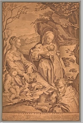 Le visage de la sainte, regardant tendrement l’Enfant tenu dans ses bras, fit l’objet d’une estampe gravée par Dominicus Custos, graveur flamand ayant émigré à Augsburg pour des raisons religieuses [voir page précédente].
