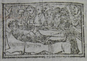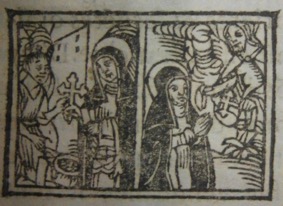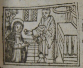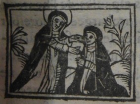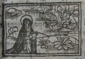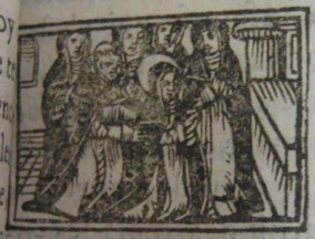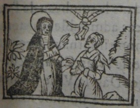 L’ouvrage est également doté de petites scènes de la vie de sainte Catherine de Sienne qui ont été gravées sur bois. Elles sont sûrement antérieures à la production du titre. La première, imprimée trois fois dans l’ouvrage, est de fait la copie d’une vignette déjà utilisée au XVIe siècle, sur la page de titre d’une Vie de la sainte [1].