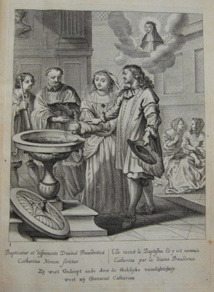 À droite : Elle recoit le Baptesme Et y est nommée / Catherine par la diuine Prouidence