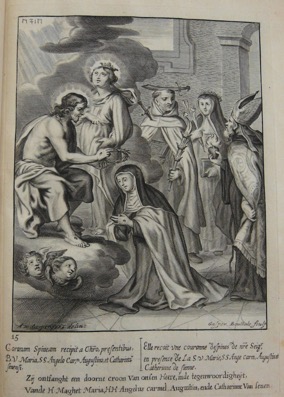 Zij ontfanght een doorne croon Van onsen Heere, inde tegenwoordigheijt, / Vande H. Maghet Maria, H H Angelus carmel, Augustin ende Catharinne Van Senen.