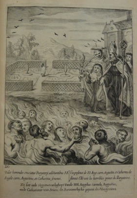À gauche : 20 / Videt horrendos cruciatus Purgatorij, adstantibus SS. / Angelo carm, Augustino, et Catharina senensi.