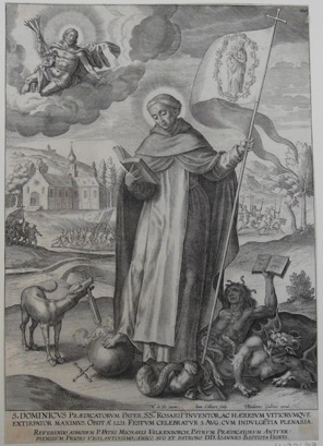 S. DOMINICVS PRÆDICATORVM PATER, SSMI ROSARII INVENTOR, AC HÆRESVM VITIORVMQVE / EXTIRPATOR MAXIMVS. OBIIT A° 1221. FESTVM CELEBRATVR 5. AVG. CVM INDVLGE[N]TIA PLENARIA. / REVERENDO ADMODVM P. PATRI MICHAELI VALKENBORCH, PATRVM PRÆDICATORVM ANTVER: / PIENSIVM PRIORI VIGILANTISSIMO, AMICO SVO ET PATRONO DD. IOANNES BAPTISTA VRINTS.