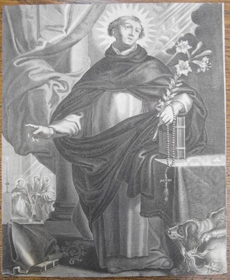 À l’intérieur d’une pièce architecturée par une colonne lisse, Dominique est présenté en pied, auréolé de rayons et une étoile à six branches sur le front. De la main gauche, il tient une branche de lys et un rosaire. Son bras prend appui sur un livre dressé sur une table couverte d’un tapis. L’index de l’autre main guide le regard du spectateur vers la scène de l’arrière-plan qui figure l’apparition de saint Pierre et de saint Paul. Dominique est donc représenté deux fois sur l’estampe. Au pied de la table, est visible la tête d’un chien tenant dans la gueule une torche enflammant un globe. Sur la gauche, mitres et crosse rappellent le refus de Dominique d’être évêque.